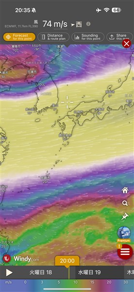 欠航予測や上空シートベルト時間予測にも役に立つのでWindyとフライトレーダーは必須です(笑)
