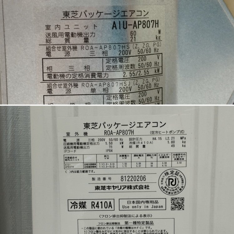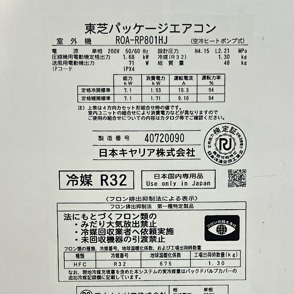 他の画像を見る 東芝 3馬力 天カセ形 ROA-RP801HJ/AIU-GP801H パッケージエアコン 単相200V 2024年 大阪店 中古品(B) 販売価格 ¥ 176,000 税込 カートに入れる お気に入りに登録する