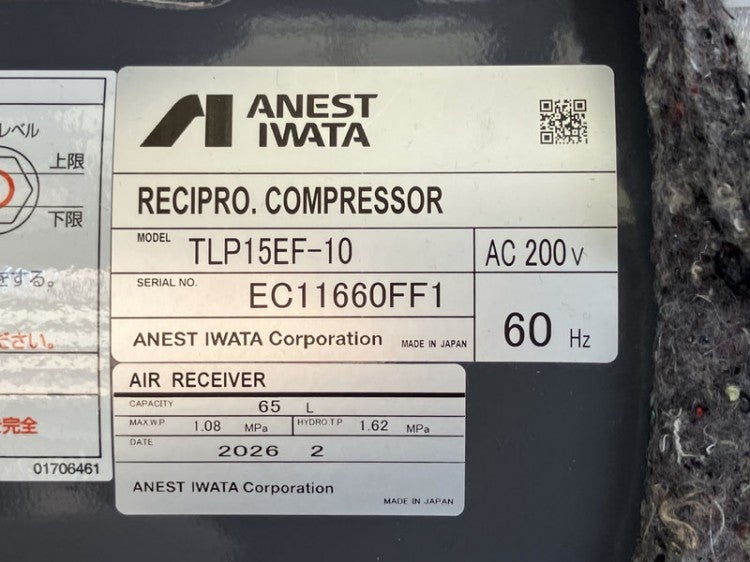 他の画像を見る 【未使用】アネスト岩田 1.5kW 2馬力 給油式レシプロコンプレッサー TLP15EF-10 60Hz専用 2026年製 大阪店 未使用品(AA) 販売価格 ¥ 198,000 税込 カートに入れる お気に入りに登録する