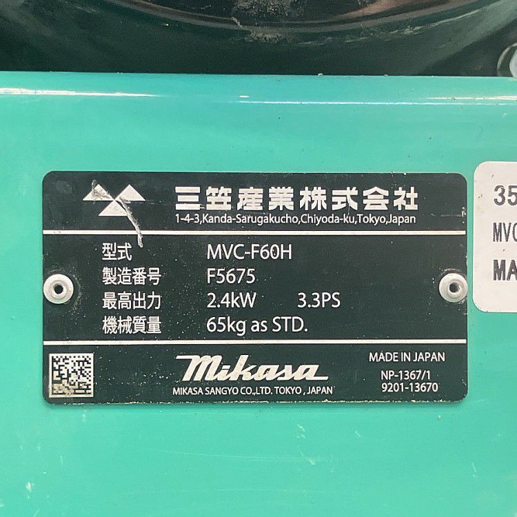 他の画像を見る Mikasa/三笠 MVH-306DSC 330kg バイブロコンパクター 前後進自在型 土木建材 愛知店 中古品(B) 販売価格 ¥ 440,000 税込 カートに入れる お気に入りに登録する