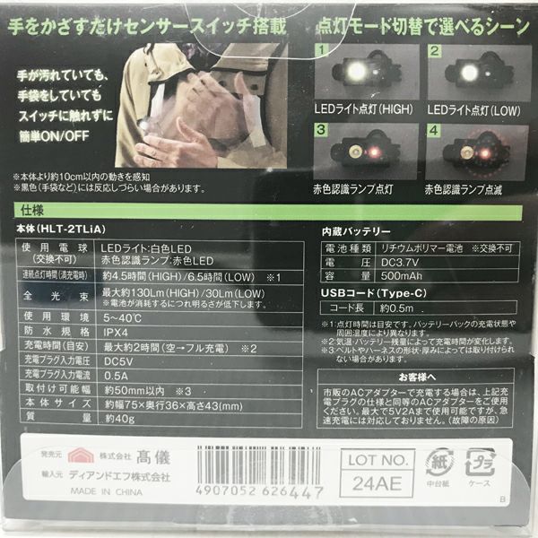他の画像を見る TAKAGI/高儀 EARTH MAN HLT-2TLiA 充電式 ベルト取付け LEDライト 手をかざすだけセンサースイッチ搭載 大阪店 送料無料!(沖縄離島除く) 未使用品(AA) 販売価格 ¥ 2,640 税込 カートに入れる お気に入りに登録する