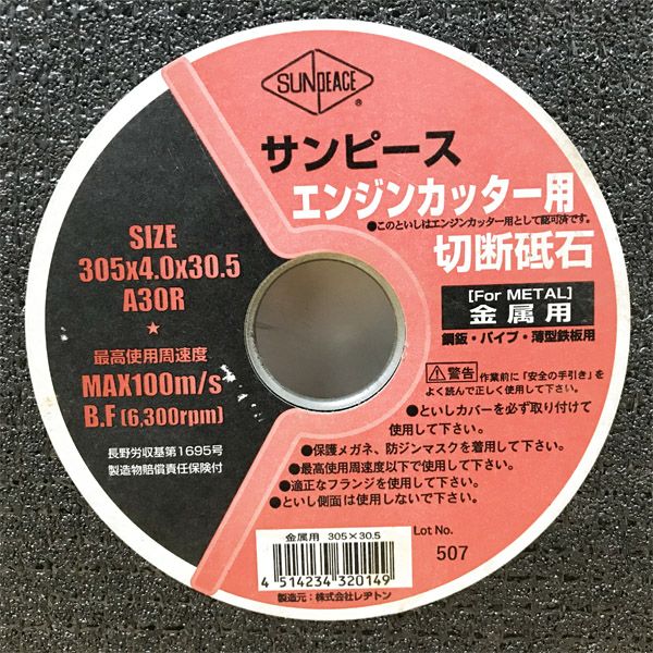 他の画像を見る SUNPEACE/サンピース A30R 305mm 30.5穴 エンジンカッター用切断砥石 大阪店 送料無料!(沖縄離島除く) 中古品(A+) 販売価格 ¥ 3,300 税込 カートに入れる お気に入りに登録する