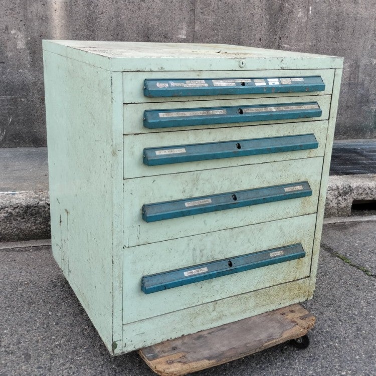 5段のツールキャビネットと、中の鉄工ドリルのセットでの販売です。
