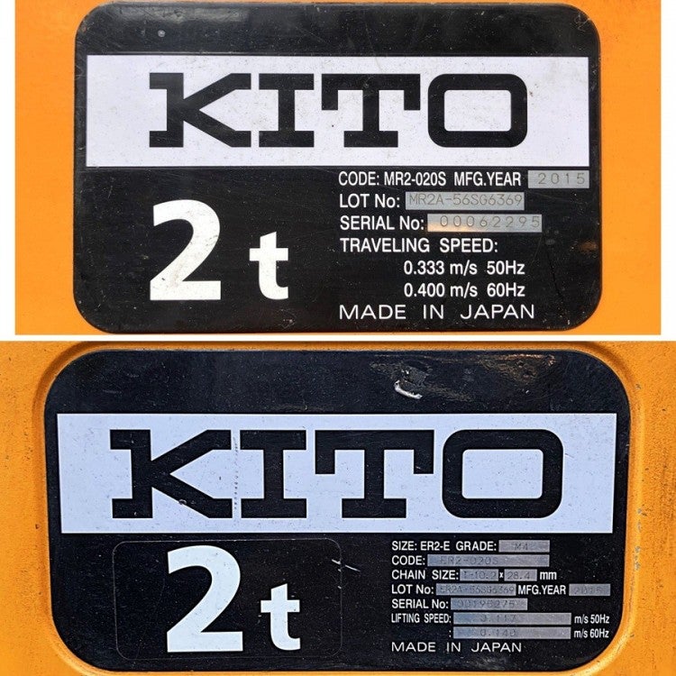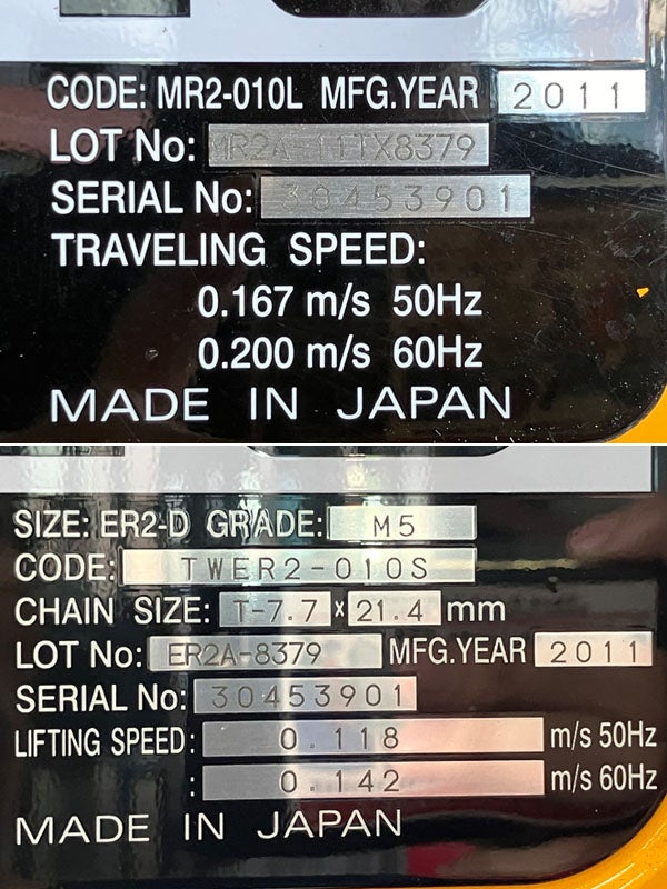 他の画像を見る [配送は要相談]KITO/キトー TWER2M-010L 1t2点水平吊り型電動チェーンブロック 電動トロリ付 揚程5.5M 愛知店 引取限定! 中古品(B) 販売価格 ¥ 330,000 税込 カートに入れる お気に入りに登録する