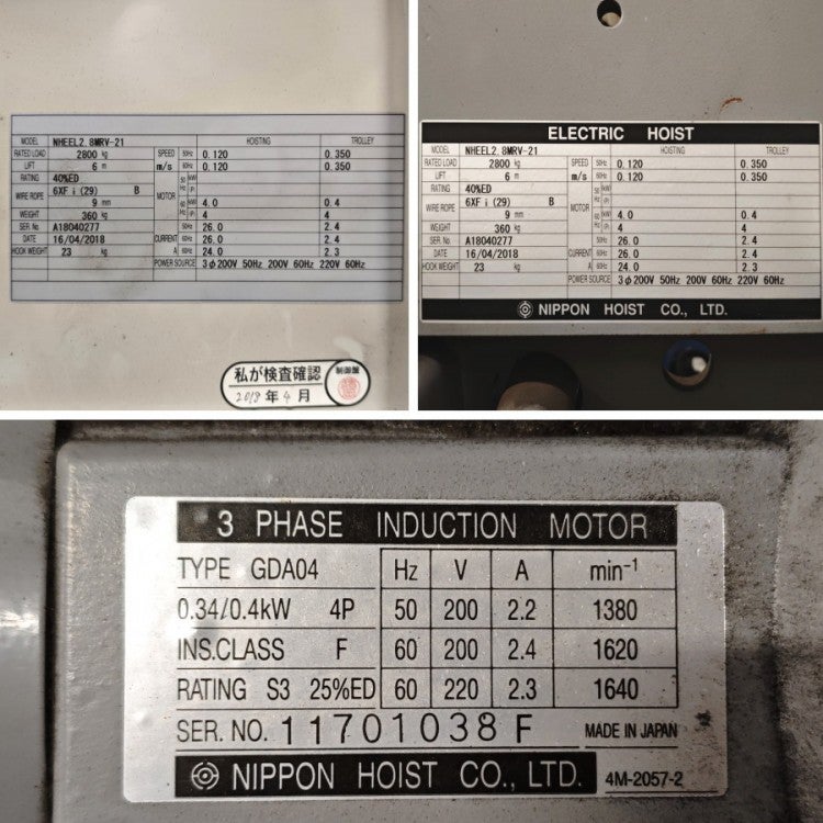 他の画像を見る [配送は要相談]日本ホイスト NHEEL2.8MRV-2 ホイスト 天井クレーン 2.8t 揚程6m ガーター10m サドルセット 愛知店 引取限定! 中古品(B) 販売価格 ¥ 1,650,000 税込 カートに入れる お気に入りに登録する