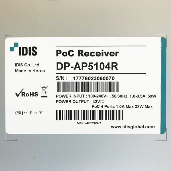 他の画像を見る IDIS/アイディス DP-AP5104R 4ch PoCカメラコントローラー カメラ電源ユニット 大阪店 送料無料!(沖縄離島除く) 未使用品(AA) 販売価格 ¥ 68,200 税込 カートに入れる お気に入りに登録する