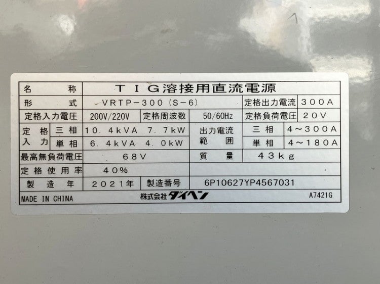 他の画像を見る DAIHEN/ダイヘン 300A TIG溶接機 VRTP-300(S-6) 2021年製 電源 リモコン 大阪店 中古品(B) 販売価格 ¥ 242,000 税込 カートに入れる お気に入りに登録する